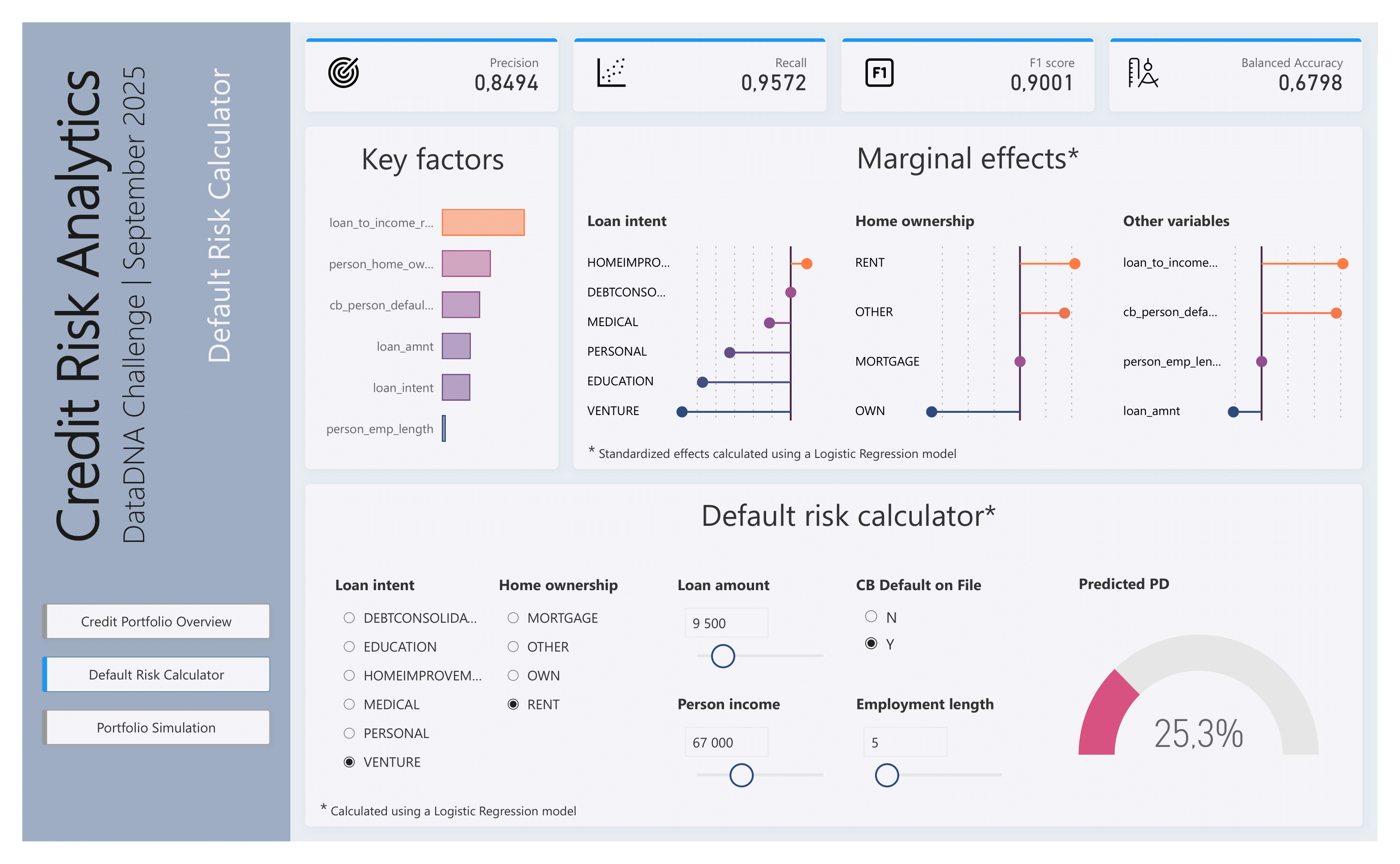 In the Portfolio Simulation there was no need to interactively calculate PDs, so I created DAX measures and slicers which filter the pre-calculated synthetic dataset, effectively allowing users to simulate different portfolio compositions and see the impact on overall default rates and losses. The underlying XGBoost model metrics demonstrated exceptional classification ability, with a Sensitivity of 0.9831 and a Specificity of 0.7012.