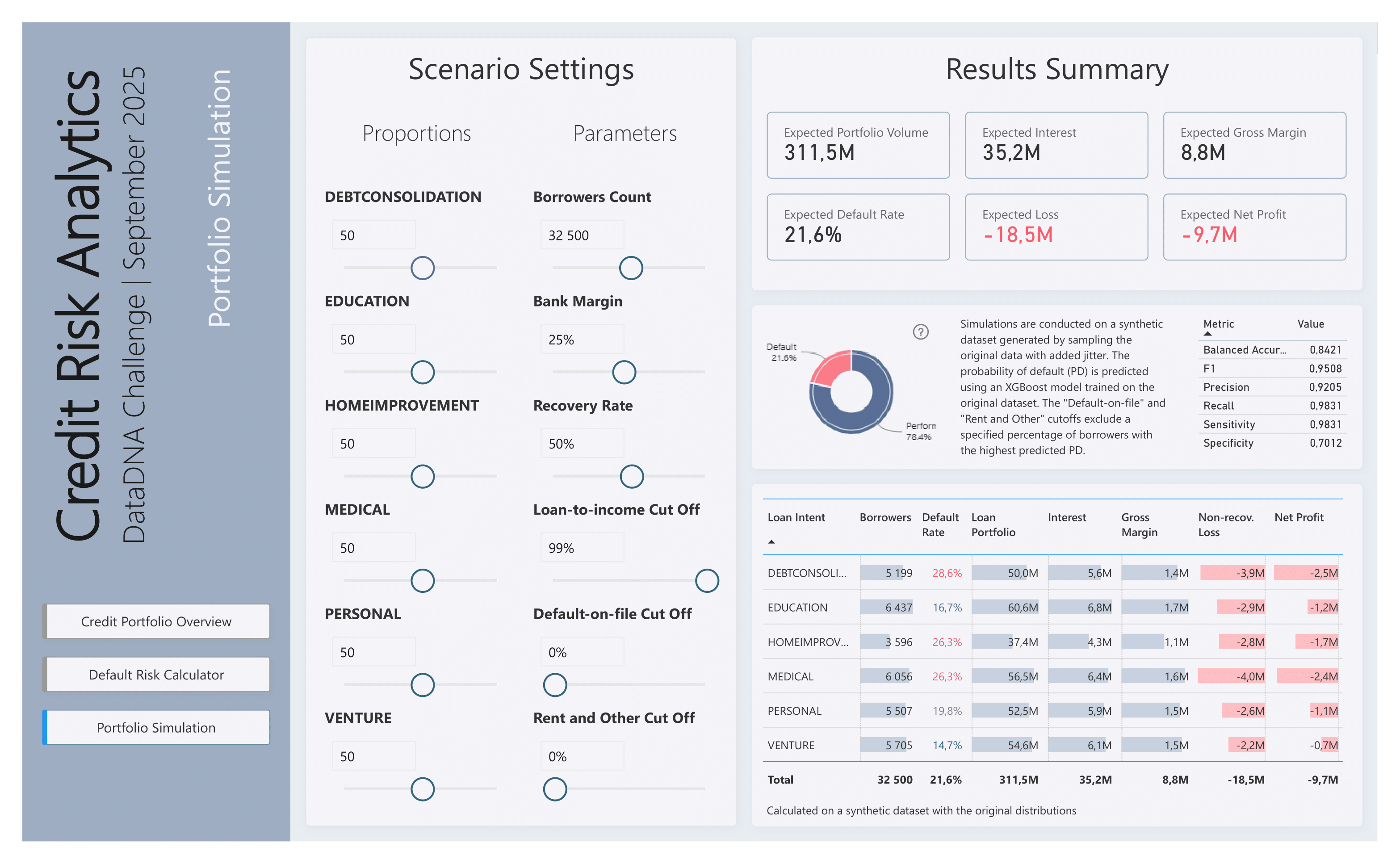 The Portfolio Simulation utilizes a high-performing XGBoost model to provide realistic scenario analysis based on synthetic data.